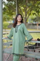 Kurta Style: Hand Embroidered Neckline with hand-style mirror reflection detailing on front placket, Hand embroidered sleeves edges