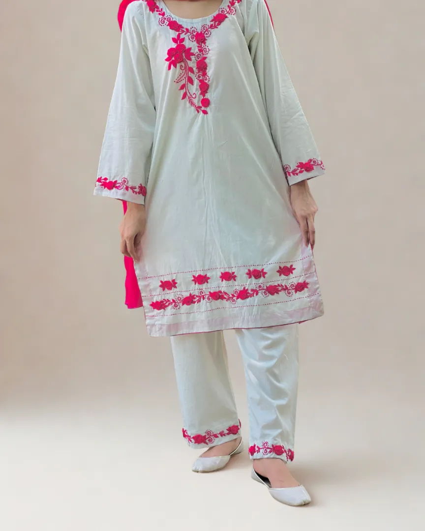 • Shirt trouser with hot pink floral hand embroidery with pink chiffon duptta